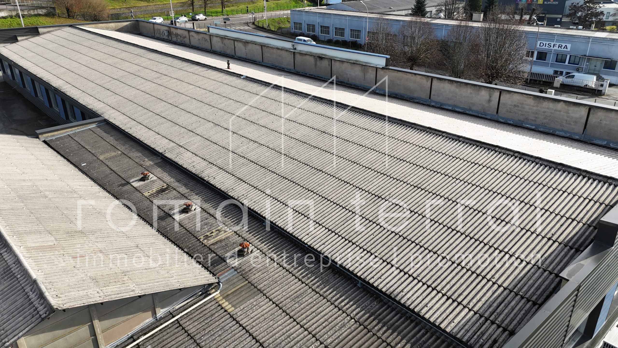 Ce bâtiment dispose d’une toiture amiantée, de type fibrociment et d’un parking d’une cinquantaine de places.